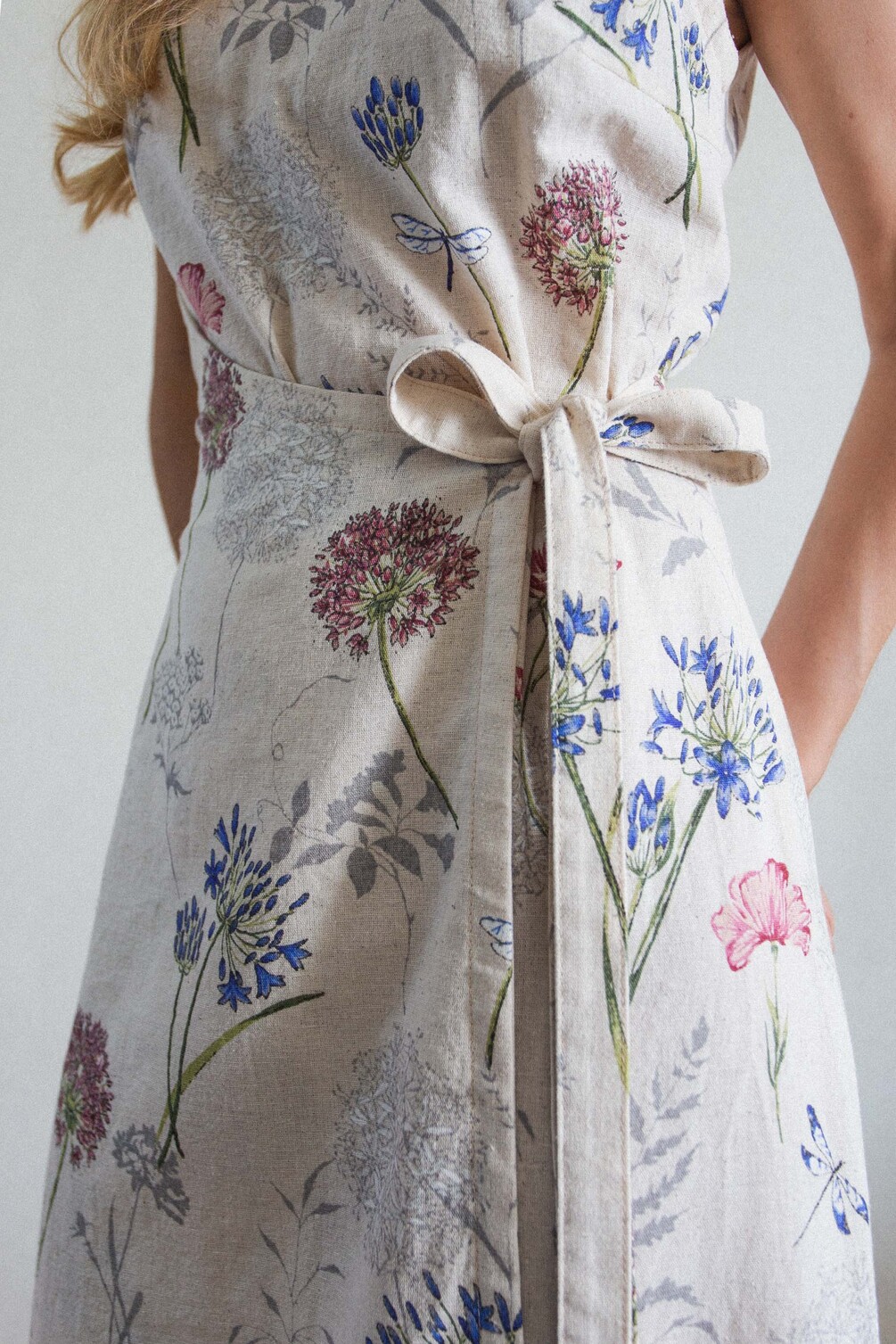 The Acacia dress is a fitted, sleeveless design that showcases a unique wrap effect at the front. The wrap panels are sewn into the sides.