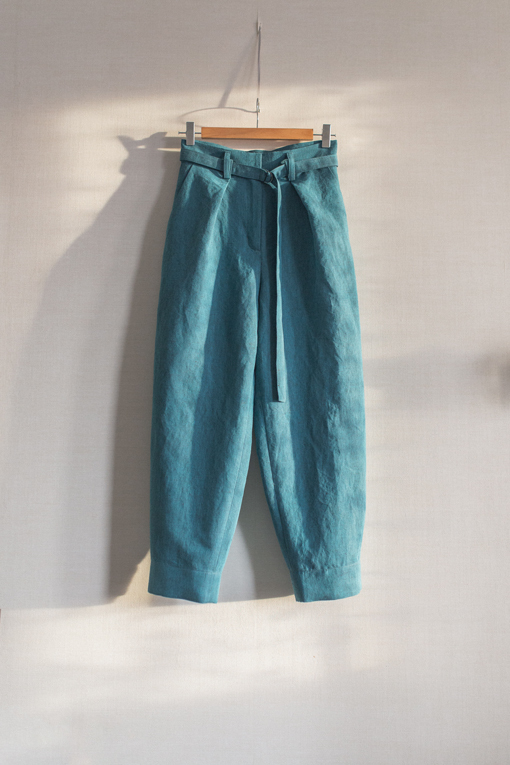 Lea is a pair of pants with functional front hip pockets. The front features two soft pleats at the waistline directed towards the center seam. The back features waist darts. The pants have a classic fly front fastening. You can choose classic belt loops for the detachable wide belt or double belt loops that allow you to wear a narrow or wide belt, as you wish.