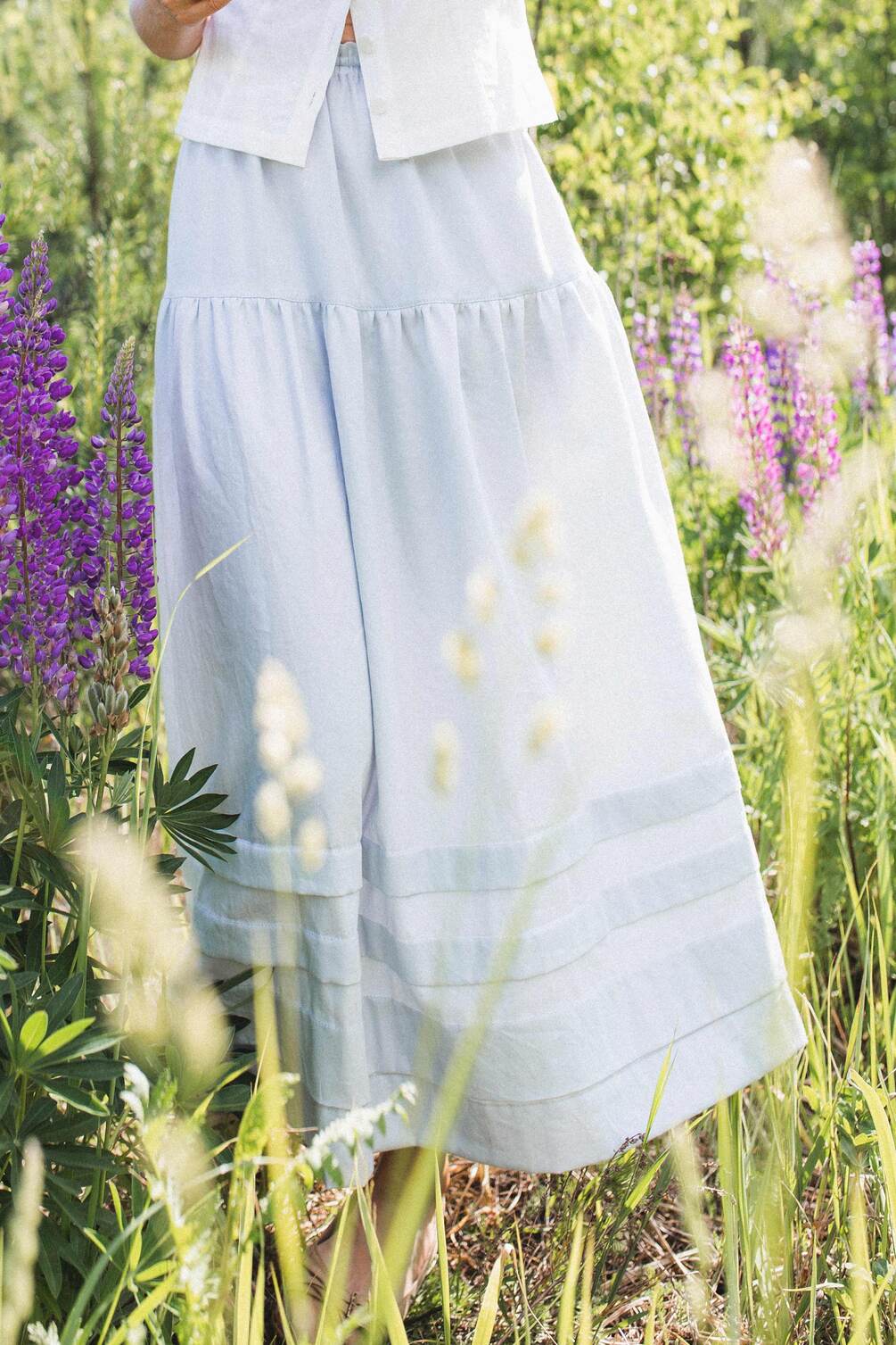 This elegant midi skirt features a flowing design that’s gathered along each tier to create pretty volume. Horizontal tiered tucks along the lower tier add structure and visual interest. The Zephyr Skirts is designed to sit comfortably at your natural waist with an elastic waistband and has practical side seam pockets. Perfect for any season, this skirt is a timeless and versatile choice.
