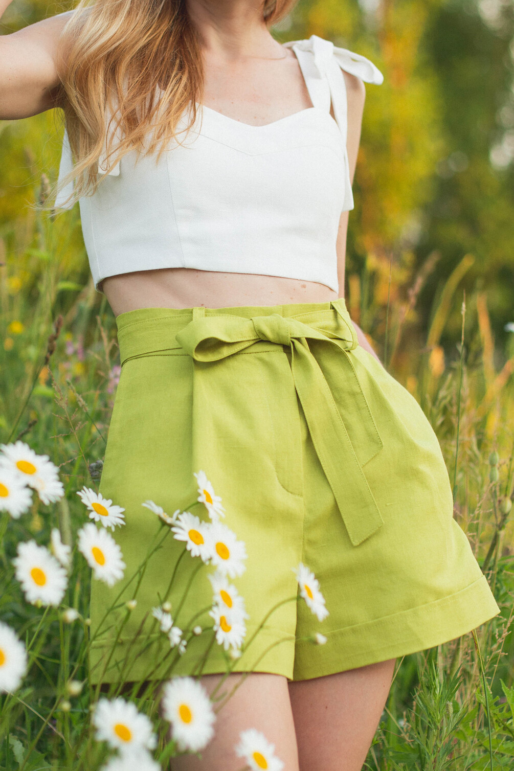 Savanna is a pair of wide-leg shorts with functional side seam pockets. The front features two soft pleats at the waistline directed towards the side seams. The back features waist darts. The waistband has topstitched belt loops, its top edge sits on the natural waistline and it fastens with a hook and eye. The shorts have a classic fly front fastening.